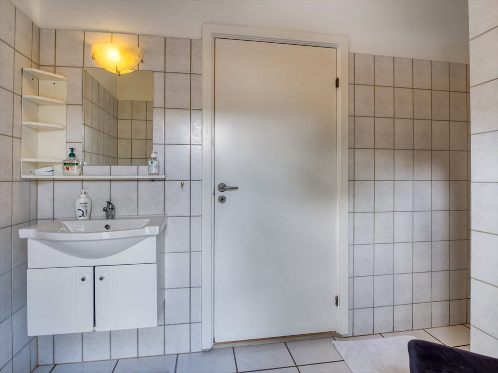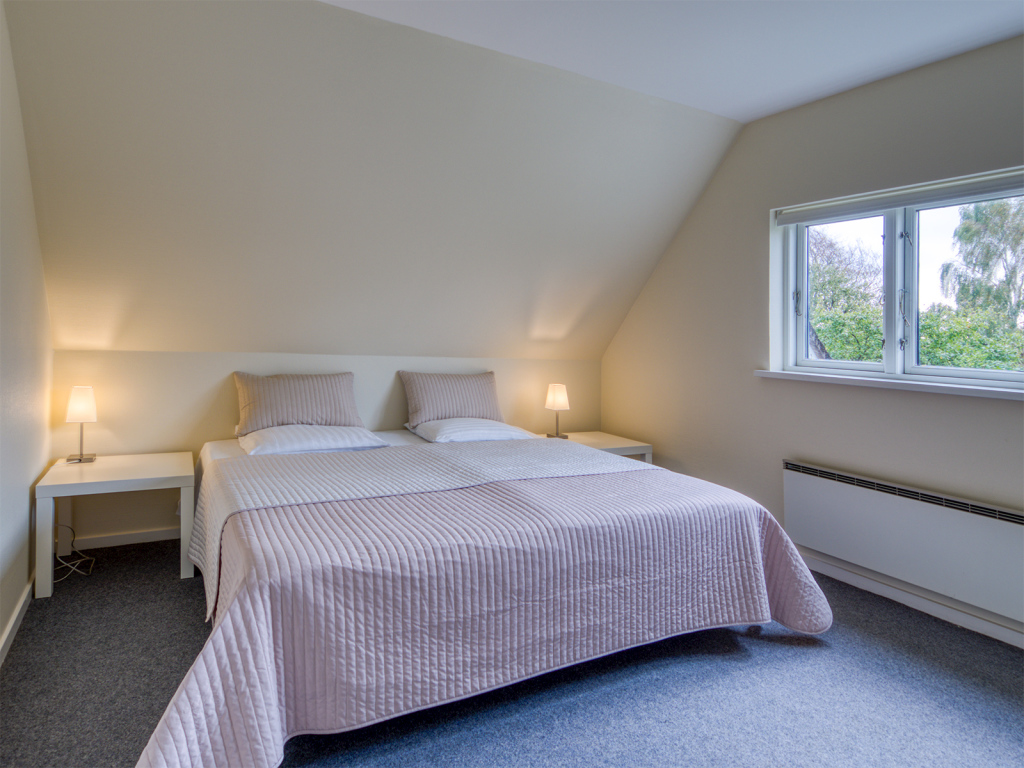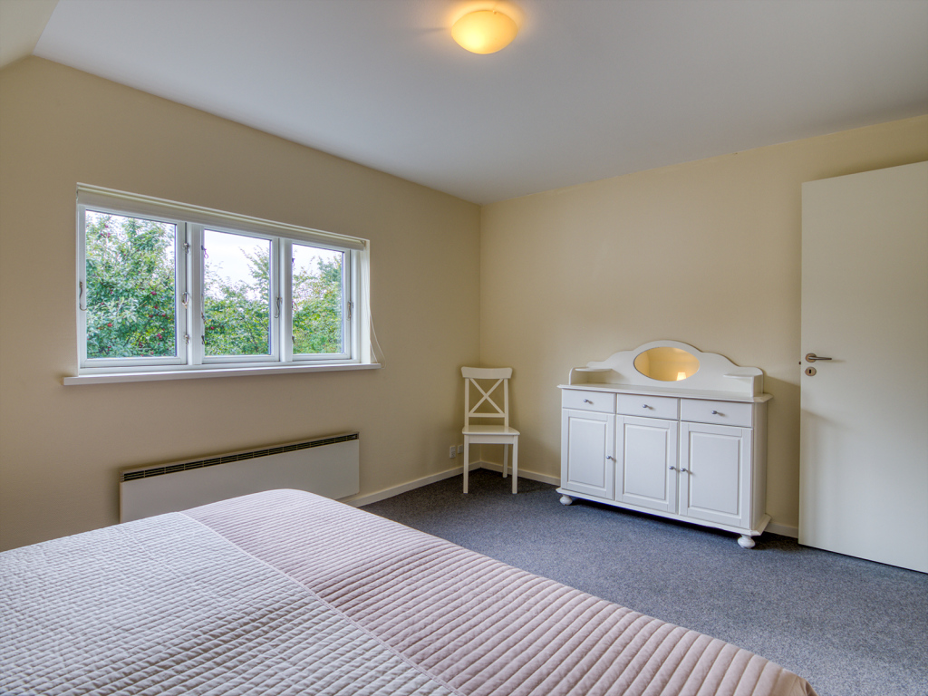 - 5 faste sovepladser fordelt på 3 værelser på overetagen. Et meget stort soveværelse med dobbelt seng, et lidt mindre værelse med dobbeltseng og et lille værelse med en enkelt seng men med plads til en opredning.
