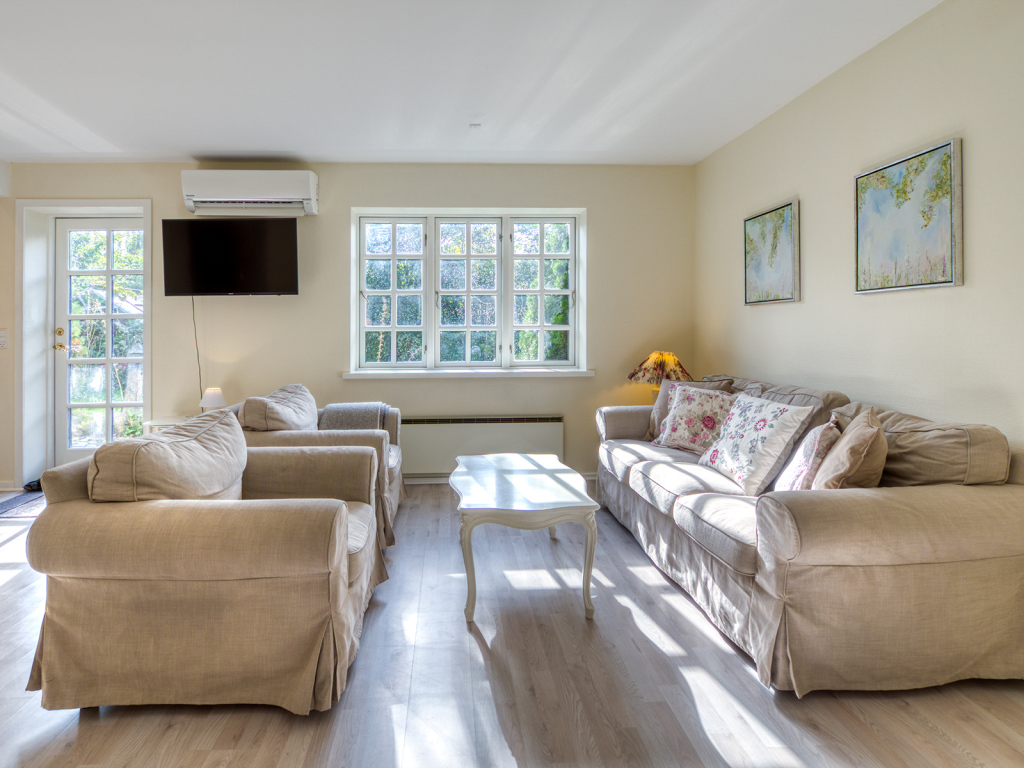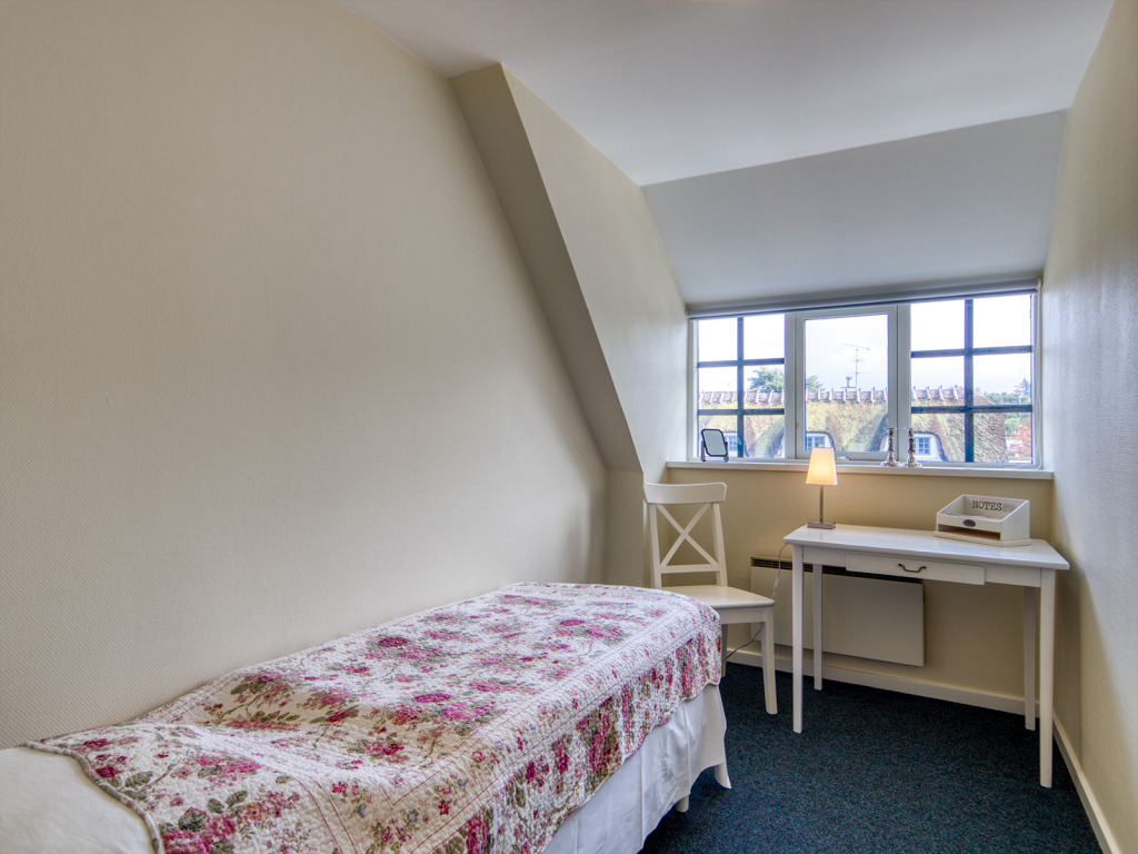 Lejligheden er beliggende i sammen bygning som vores spisesal i en af sidelængerne. Den er ca. 100 m2. Lejligheden er i den ene ende af bygningen og har egen lille have mod syd med havemøbler.